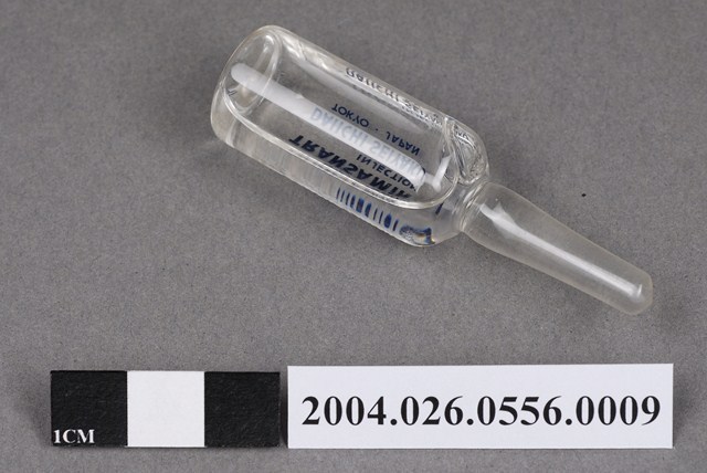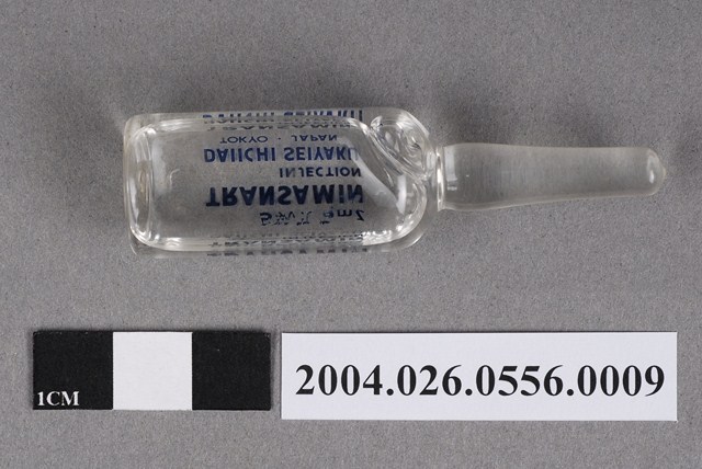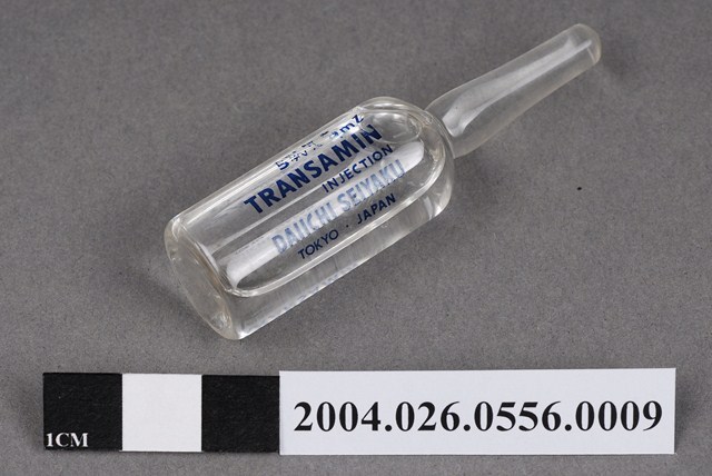 本物件為日本第一製藥株式會社出品TRANSAMIN注射液之藥瓶。藥瓶為一體成形,透明無色。瓶身印有5w/v%、5ml、TRANSAMIN、INJECTION、DAIICHI SEIYAKU、TOKYO JAPAN字樣。內有透明無色液體。
