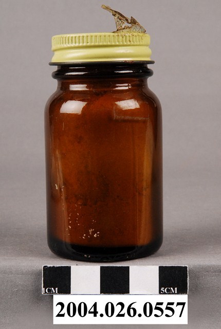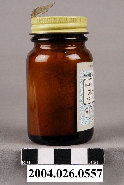 1. 本物件為保榮藥工株式會社製造蛋白銀。藥瓶為透明茶色玻璃材質,有金屬蓋。瓶身貼有標籤,標籤印有內衛藥輸字第00469號、局所殺菌、收れん劑、25g、日本藥局方、プロテイン銀、蛋白銀等字樣,以及製藥廠資訊。瓶內有粉狀物。