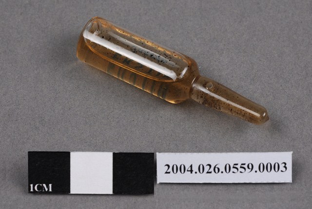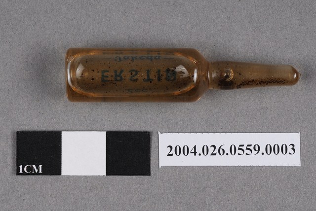 1. 本物件為台灣武田藥品工業股份有限公司出品愛而斯丁注射液之藥瓶。藥瓶為一體成形,外觀透明無色,瓶身印有藍色字體,有2cc、ERSTIN、Takeda字樣。瓶內有茶色液體,似有顆粒。 2. 本產品標有衛藥字8524號,應為二戰之後的產品,但在衛生福利部食品藥物管理署查無此藥資料。 3. 台灣武田藥品工業股份有限公司創立於西元1962年,為日本武田藥品工業株式會社之海外投資機構之一。是故,本藥品是西元1962年之後的產品。