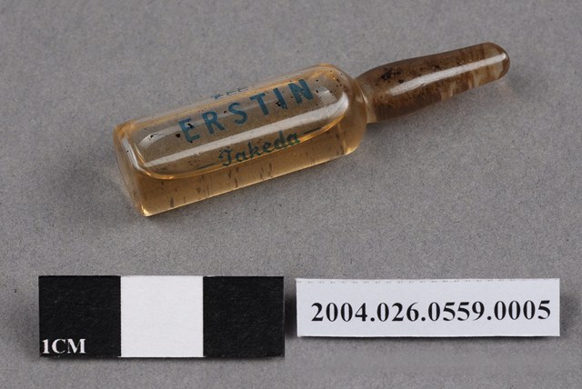 1. 本物件為台灣武田藥品工業股份有限公司出品愛而斯丁注射液之藥瓶。藥瓶為一體成形,外觀透明無色,瓶身印有藍色字體,有2cc、ERSTIN、Takeda字樣。瓶內有茶色液體,似有顆粒。
