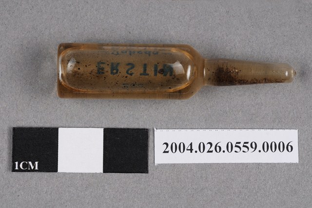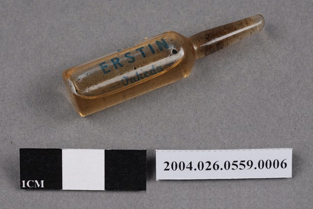 1. 本物件為台灣武田藥品工業股份有限公司出品愛而斯丁注射液之藥瓶。藥瓶為一體成形,外觀透明無色,瓶身印有藍色字體,有2cc、ERSTIN、Takeda字樣。瓶內有茶色液體,似有顆粒。