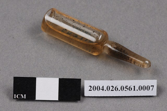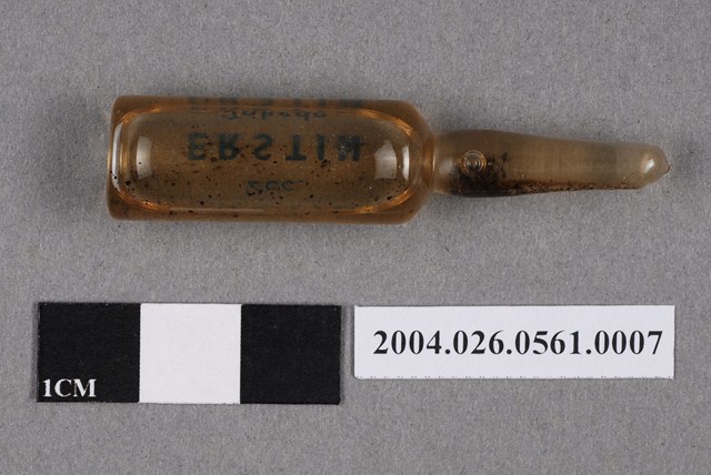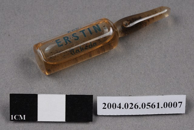 1. 本物件為台灣武田藥品工業股份有限公司出品愛而斯丁注射液之藥瓶。藥瓶為一體成形,外觀透明無色,瓶身印有藍色字體,有2cc、ERSTIN、Takeda字樣。瓶內有茶色液體,似有顆粒。 2. 本產品標有衛藥字8524號,應為二戰之後的產品,但在衛生福利部食品藥物管理署查無此藥資料。 3. 台灣武田藥品工業股份有限公司創立於西元1962年,為日本武田藥品工業株式會社之海外投資機構之一。是故,本藥品是西元1962年之後的產品。