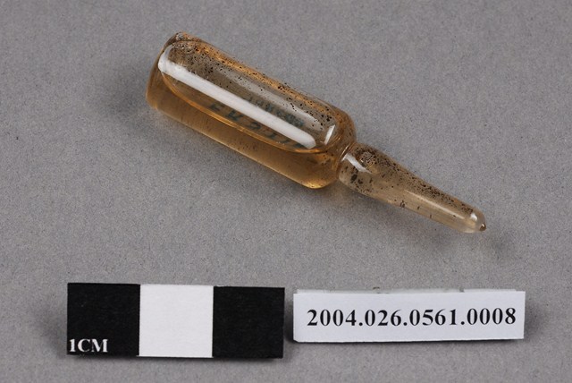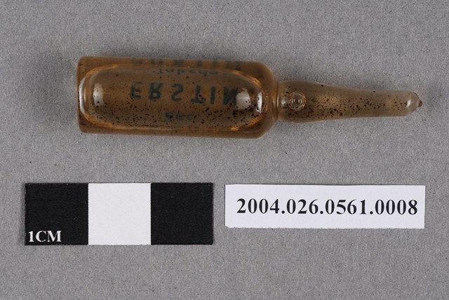 1. 本物件為台灣武田藥品工業股份有限公司出品愛而斯丁注射液之藥瓶。藥瓶為一體成形,外觀透明無色,瓶身印有藍色字體,有2cc、ERSTIN、Takeda字樣。瓶內有茶色液體,似有顆粒。 2. 本產品標有衛藥字8524號,應為二戰之後的產品,但在衛生福利部食品藥物管理署查無此藥資料。 3. 台灣武田藥品工業股份有限公司創立於西元1962年,為日本武田藥品工業株式會社之海外投資機構之一。是故,本藥品是西元1962年之後的產品。