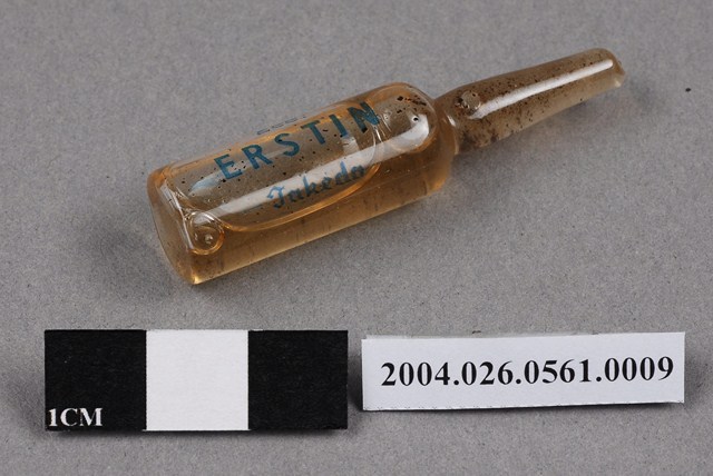 1. 本物件為台灣武田藥品工業股份有限公司出品愛而斯丁注射液之藥瓶。藥瓶為一體成形,外觀透明無色,瓶身印有藍色字體,有2cc、ERSTIN、Takeda字樣。瓶內有茶色液體,似有顆粒。 2. 本產品標有衛藥字8524號,應為二戰之後的產品,但在衛生福利部食品藥物管理署查無此藥資料。 3. 台灣武田藥品工業股份有限公司創立於西元1962年,為日本武田藥品工業株式會社之海外投資機構之一。是故,本藥品是西元1962年之後的產品。
