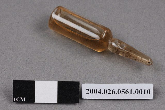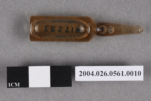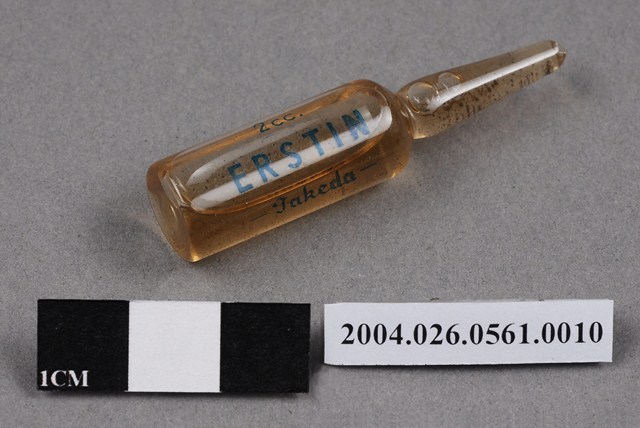 1. 本物件為台灣武田藥品工業股份有限公司出品愛而斯丁注射液之藥瓶。藥瓶為一體成形,外觀透明無色,瓶身印有藍色字體,有2cc、ERSTIN、Takeda字樣。瓶內有茶色液體,似有顆粒。 2. 本產品標有衛藥字8524號,應為二戰之後的產品,但在衛生福利部食品藥物管理署查無此藥資料。 3. 台灣武田藥品工業股份有限公司創立於西元1962年,為日本武田藥品工業株式會社之海外投資機構之一。是故,本藥品是西元1962年之後的產品。