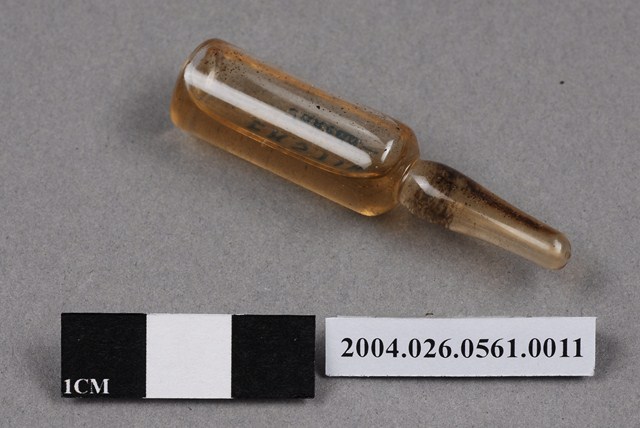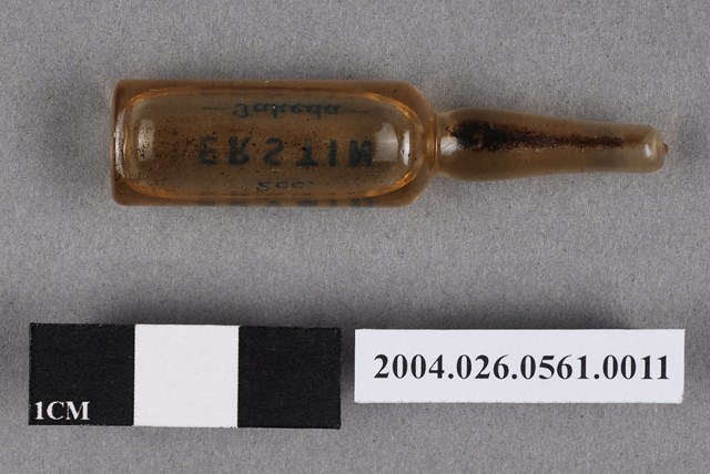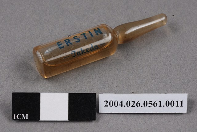 1. 本物件為台灣武田藥品工業股份有限公司出品愛而斯丁注射液之藥瓶。藥瓶為一體成形,外觀透明無色,瓶身印有藍色字體,有2cc、ERSTIN、Takeda字樣。瓶內有茶色液體,似有顆粒。 2. 本產品標有衛藥字8524號,應為二戰之後的產品,但在衛生福利部食品藥物管理署查無此藥資料。 3. 台灣武田藥品工業股份有限公司創立於西元1962年,為日本武田藥品工業株式會社之海外投資機構之一。是故,本藥品是西元1962年之後的產品。