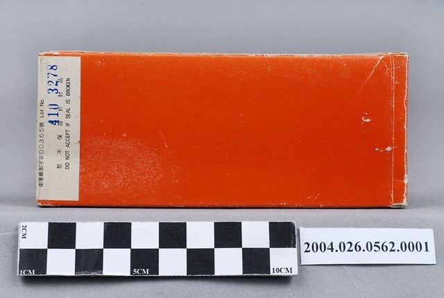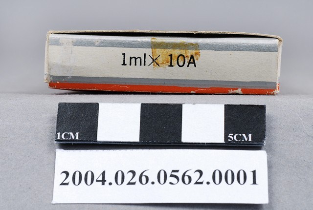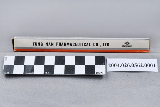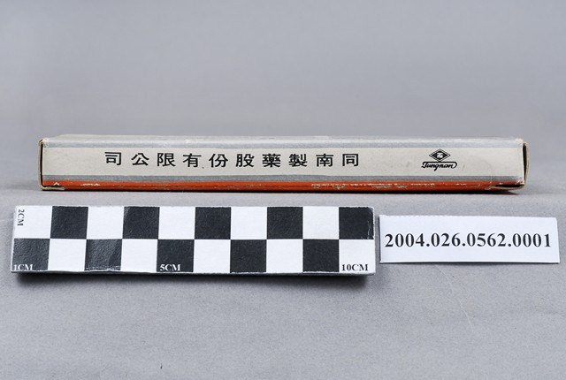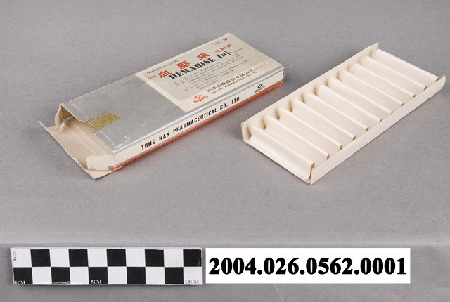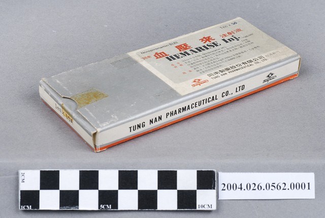 1. 本物件為同南製藥股份有限公司出品血壓來注射液包裝紙盒。封面貼有標籤,其上印有血壓來注射液、Norepirenamin製劑、1ccx50等字樣,以及成分、效能、用法和製藥廠資訊,可以治療休克、急性低血壓等症狀。盒蓋上印有交感神經興奮劑字樣。盒底印有衛署藥製字第00365號字樣。盒內有紙製容器,有10格。 2. 本產品標有衛署藥製字第00365號,應為西元1971-2013年許可字號的產物,但在衛生福利部食品藥物管理署查無此字號之產品。