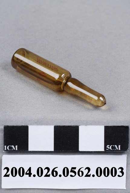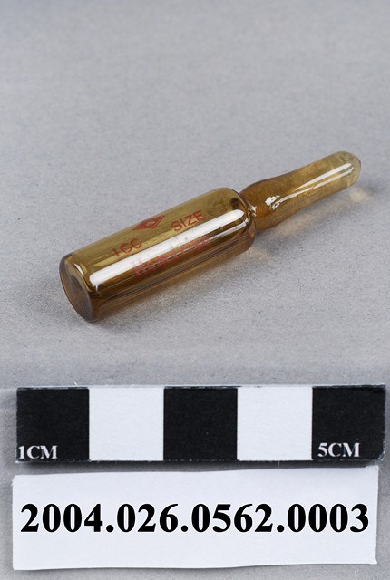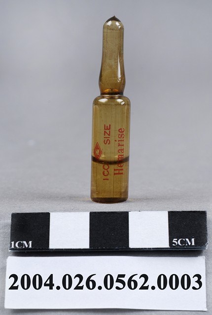 1. 本物件為同南製藥股份有限公司出品血壓來注射液之藥瓶。藥瓶為一體成形,外觀透明無色,瓶身印有商標和紅色字體,有1cc、size、Hemarise字樣。瓶內有茶色液體,似有顆粒。 2. 本產品標有衛署藥製字第00365號,應為西元1971-2013年許可字號的產物,但在衛生福利部食品藥物管理署查無此字號之產品。