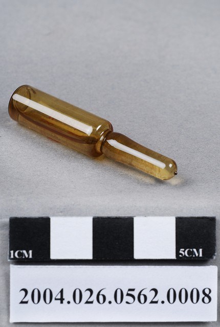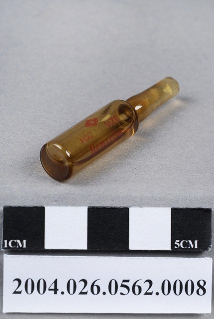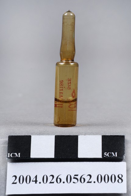 1. 本物件為同南製藥股份有限公司出品血壓來注射液之藥瓶。藥瓶為一體成形,外觀透明無色,瓶身印有商標和紅色字體,有1cc、size、Hemarise字樣。瓶內有茶色液體,似有顆粒。 2. 本產品標有衛署藥製字第00365號,應為西元1971-2013年許可字號的產物,但在衛生福利部食品藥物管理署查無此字號之產品。