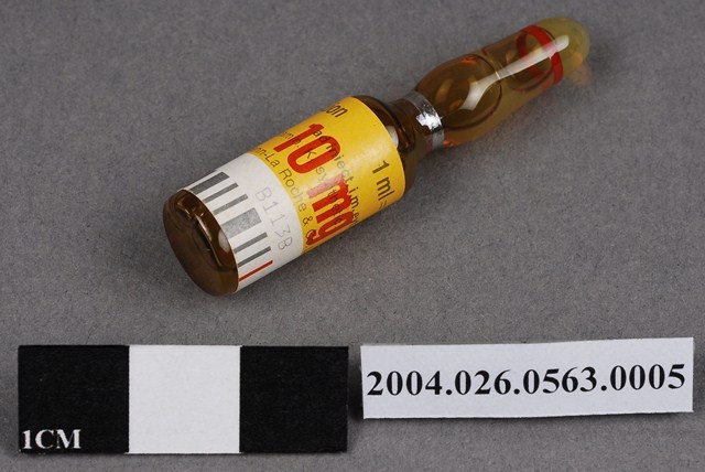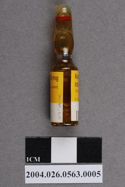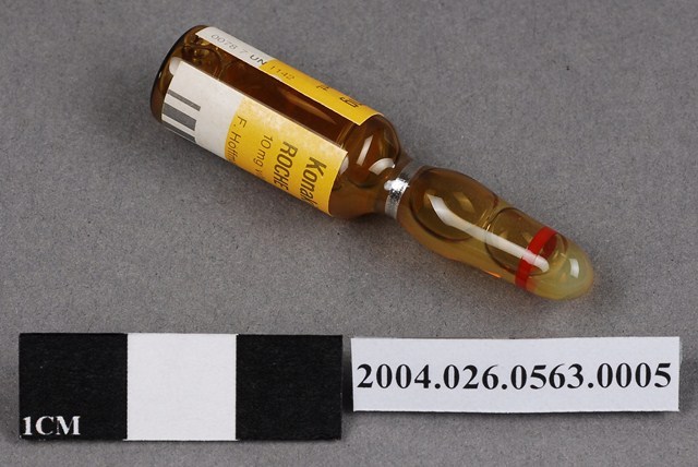 本物件為瑞士ROCHE製Konakion之藥瓶。藥瓶為一體成形,藥瓶上有紅色和銀色環,瓶身有標籤,有1ml、Konakion、ROCHE、10mg字樣。瓶內有茶色液體。