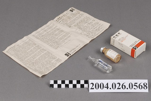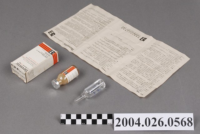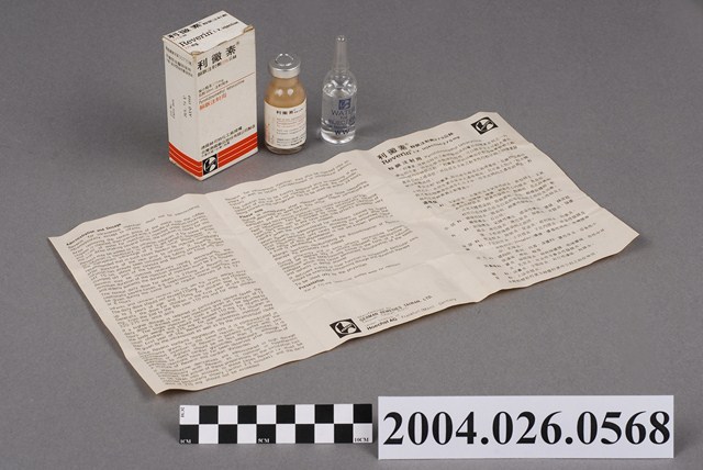 1. 本物件為台灣德國藥品股份有限公司製造利黴素靜脈注射劑。共有4種物品,分別是包裝紙盒、藥瓶、注射用水和說明書。 2. 本藥品之藥瓶有標示Expiry date為FEB 1980,所以紙盒上的JAN 76是西元1976年1月,應為製造日期。