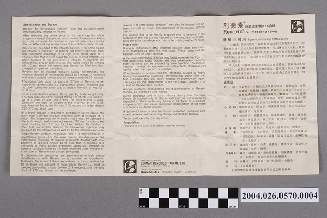 2004.026.0570.0004 臺灣德國藥品股份有限公司製造利黴素靜脈注射劑說明書