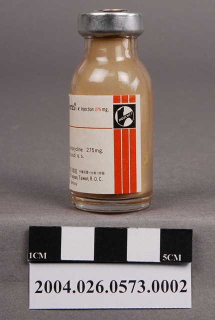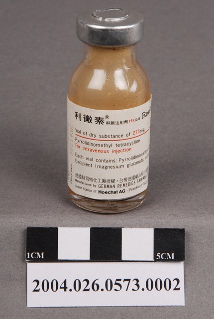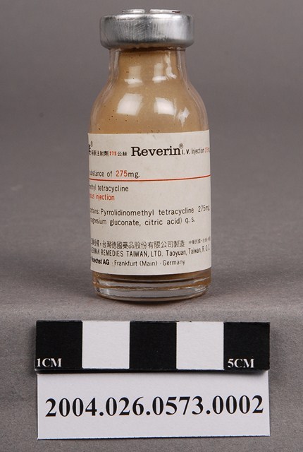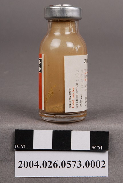 1. 本物件為台灣德國藥品股份有限公司製造利黴素靜脈注射劑之藥瓶。藥瓶為金屬瓶蓋和玻璃瓶身。瓶身貼有標籤,印有利黴素、靜脈注射劑275公絲、Reverin、衛署藥製字第00770號和FEB 1980等字樣,以及成分、製藥廠資訊。瓶內有茶色物質。 2. 本藥品之藥瓶有標示Expiry date為FEB 1980,所以紙盒上的JAN 76是西元1976年1月,應為製造日期。