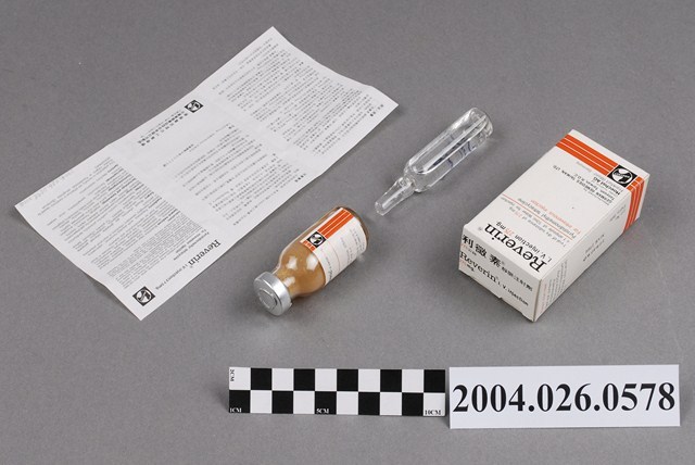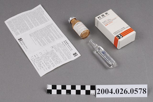 1. 本物件為台灣德國藥品股份有限公司製造利黴素靜脈注射劑。共有4種物品,分別是包裝紙盒、藥瓶、注射用水和說明書。 2. 本藥品紙盒有標示Expiry date為MAR 1984,所以FEB 80是西元1980年2月,應為製造日期。