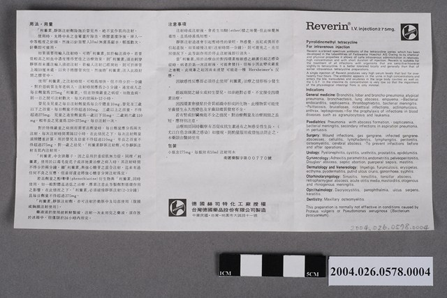 1. 本物件為台灣德國藥品股份有限公司製造利黴素靜脈注射劑說明書。說明書為單張紙,雙面有字。說明書上印有適應症、用法用量、注意事項等中英文內容。此藥品可治療支氣管炎、百日咳、尿道炎、乳腺炎等。 2. 本藥品紙盒有標示Expiry date為MAR 1984,所以FEB 80是西元1980年2月,應為製造日期。