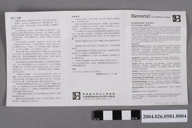 1. 本物件為台灣德國藥品股份有限公司製造利黴素靜脈注射劑說明書。說明書為單張紙,雙面有字。說明書上印有適應症、用法用量、注意事項等中英文內容。此藥品可治療支氣管炎、百日咳、尿道炎、乳腺炎等。 2. 本藥品紙盒有標示Expiry date為MAR 1984,所以FEB 80是西元1980年2月,應為製造日期。
