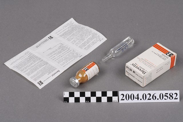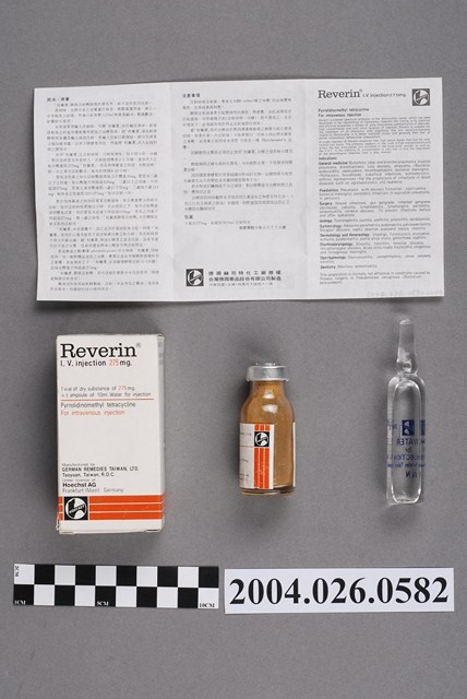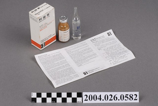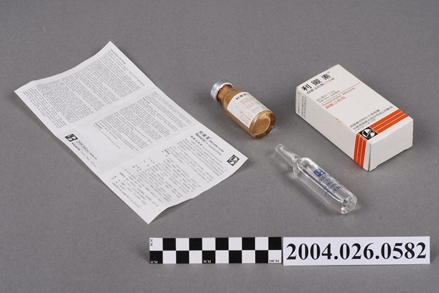 1. 本物件為台灣德國藥品股份有限公司製造利黴素靜脈注射劑。共有4種物品,分別是包裝紙盒、藥瓶、注射用水和說明書。 2. 本藥品紙盒有標示Expiry date為MAR 1984,所以FEB 80是西元1980年2月,應為製造日期。