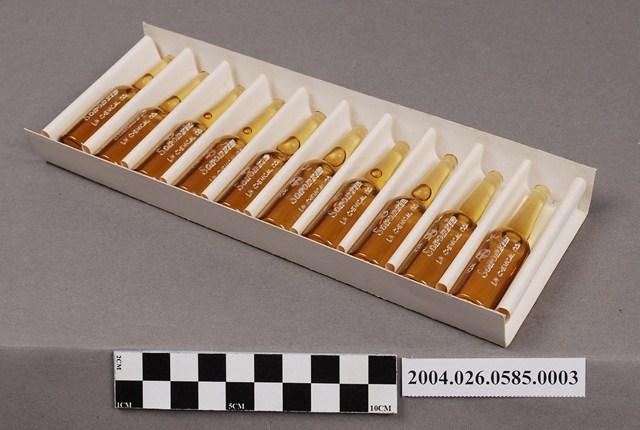 1. 本物件為林化學製藥股份有限公司出品掃膿淨注射液第二層。第二層容器為紙製品,全白色無字無圖,可放10瓶藥瓶。藥瓶為一體成形,印有白色字體。 2. 本藥品標有內衛藥製字第04181號,應為西元1949-1971年許可字號的產物,但在衛生福利部食品藥物管理署查無此藥資料。