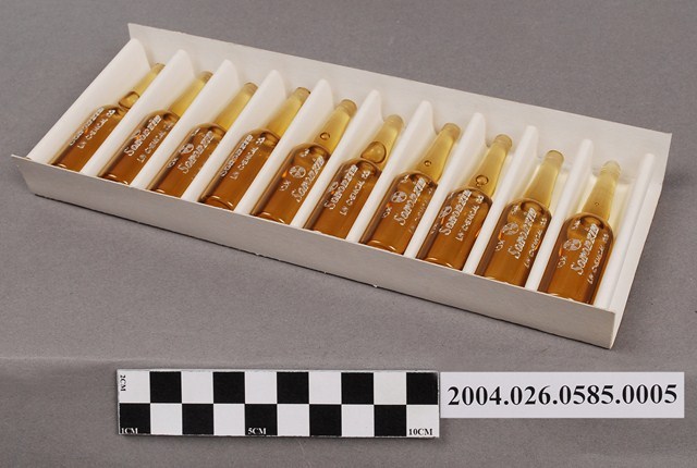 1. 本物件為林化學製藥股份有限公司出品掃膿淨注射液第四層。第四層容器為紙製品,全白色無字無圖,可放10瓶藥瓶。藥瓶為一體成形,印有白色字體。 2. 本藥品標有內衛藥製字第04181號,應為西元1949-1971年許可字號的產物,但在衛生福利部食品藥物管理署查無此藥資料。