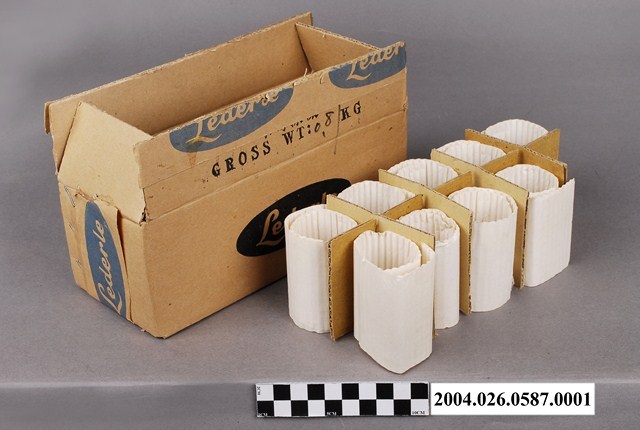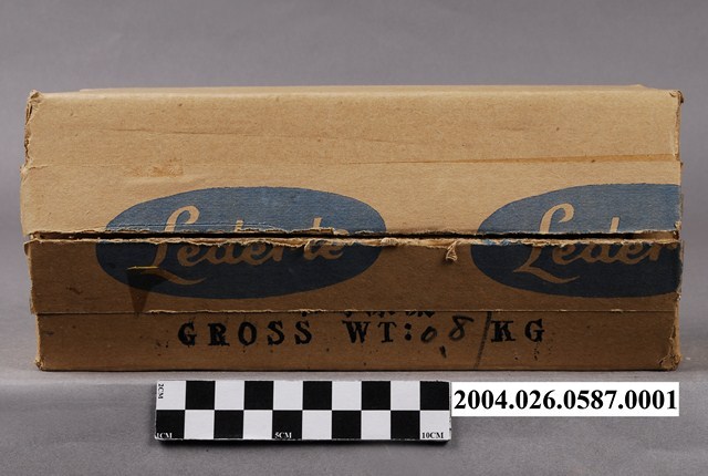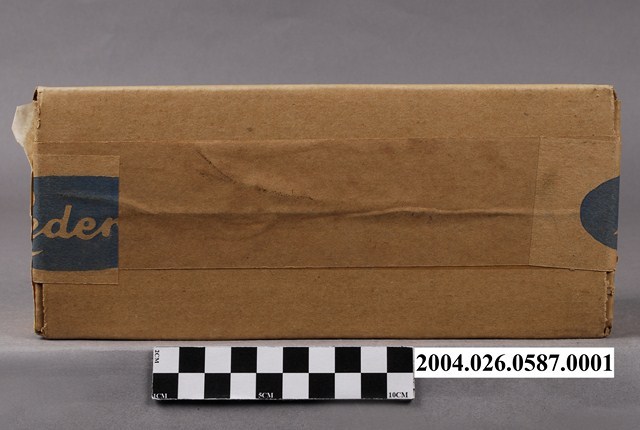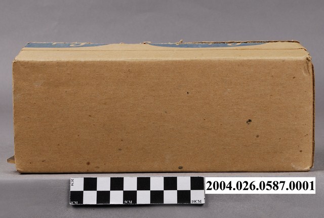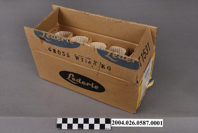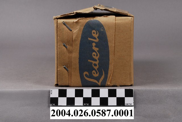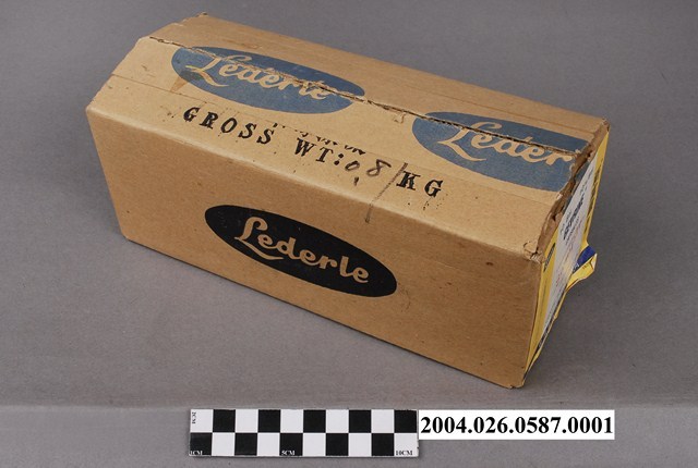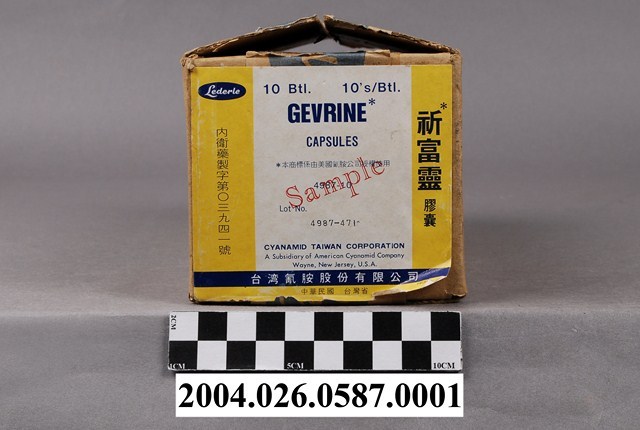 1. 本物件為臺灣氰胺股份有限公司製祈富靈膠囊包裝紙盒。紙盒外觀為牛皮紙色,上面印有Lederle、GROSS WT:0.8KG字樣,以及貼有標籤。標籤上印有祈富靈膠囊、Lederle、GEVRINE、內衛藥製字第03941號、sample、臺灣氰胺股份有限公司等字樣。盒內空間被紙片格成10格,有9格內放有一捲紙捲。