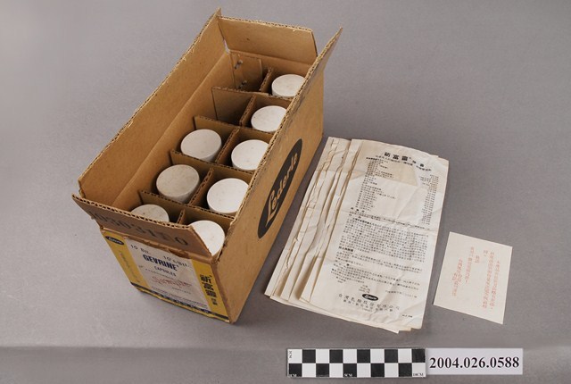 1. 本物件為臺灣氰胺股份有限公司製祈富靈膠囊。共有3種物品,分別為包裝紙盒、藥瓶和說明書。 2. 本藥品標有內衛藥製字第03941號,應為西元1949-1971年許可字號的產物,但在衛生福利部食品藥物管理署查無此字號資料。