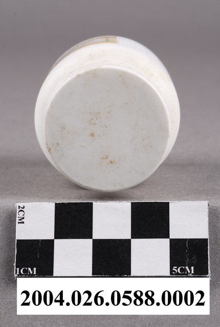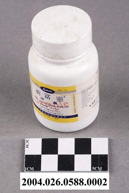 1. 本物件為臺灣氰胺股份有限公司製祈富靈膠囊之藥瓶。藥瓶瓶蓋及瓶身為白色塑膠製,不透明,無法透視內部藥物。瓶身貼有標籤,標籤上印有Lederle、祈富靈膠囊、中老年人的維他命礦物質荷爾蒙補劑、內衛藥製字第03941號、sample等字樣,以及成分內容。