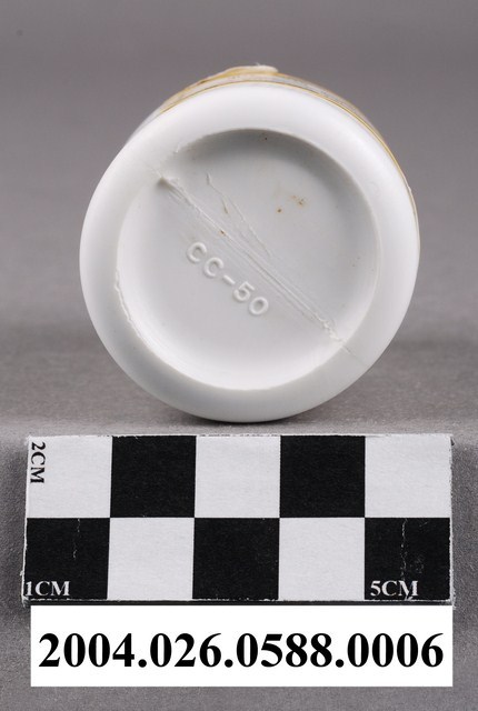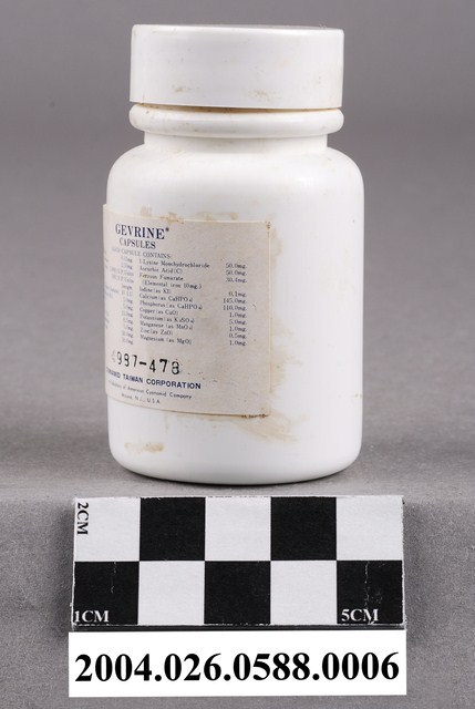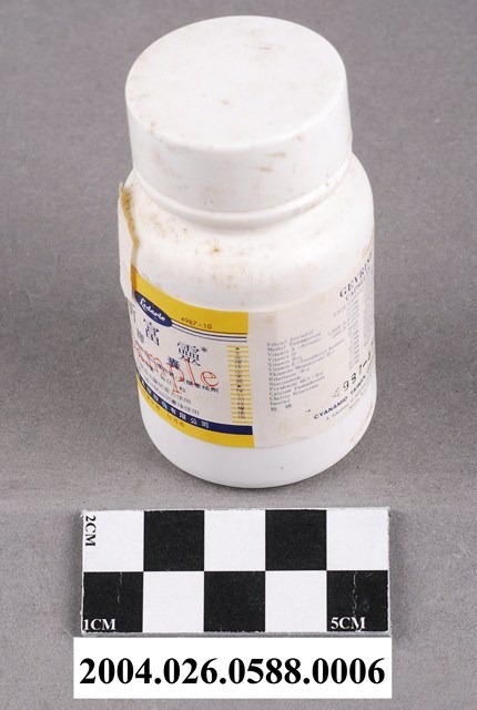 1. 本物件為臺灣氰胺股份有限公司製祈富靈膠囊之藥瓶。藥瓶瓶蓋及瓶身為白色塑膠製,不透明,無法透視內部藥物。瓶身貼有標籤,標籤上印有Lederle、祈富靈膠囊、中老年人的維他命礦物質荷爾蒙補劑、內衛藥製字第03941號、sample等字樣,以及成分內容。