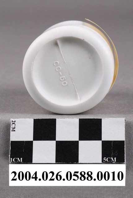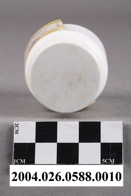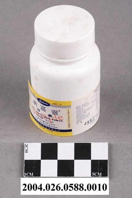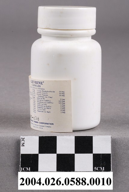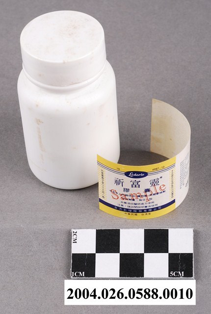 1. 本物件為臺灣氰胺股份有限公司製祈富靈膠囊之藥瓶。藥瓶瓶蓋及瓶身為白色塑膠製,不透明,無法透視內部藥物。瓶身貼有標籤,標籤上印有Lederle、祈富靈膠囊、中老年人的維他命礦物質荷爾蒙補劑、內衛藥製字第03941號、sample等字樣,以及成分內容。