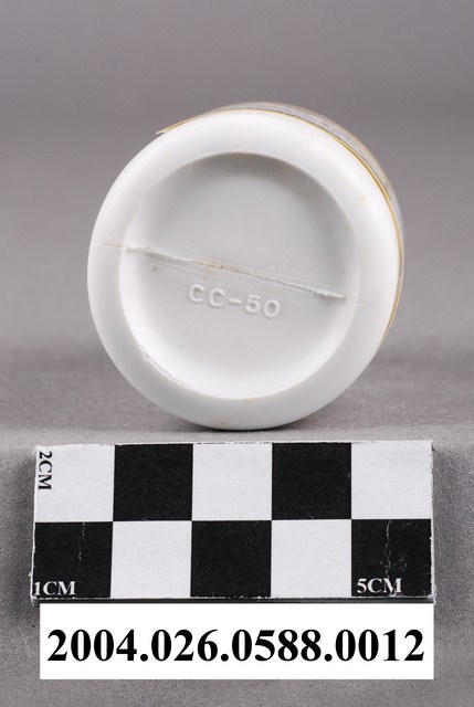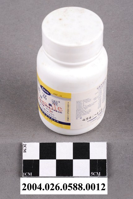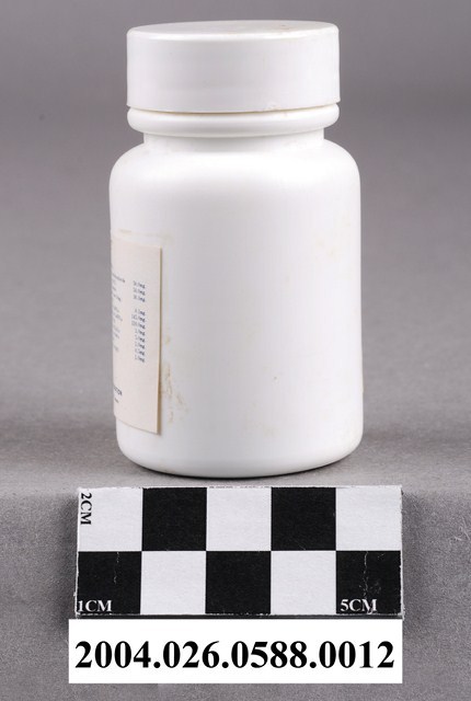 1. 本物件為臺灣氰胺股份有限公司製祈富靈膠囊之藥瓶。藥瓶瓶蓋及瓶身為白色塑膠製,不透明,無法透視內部藥物。瓶身貼有標籤,標籤上印有Lederle、祈富靈膠囊、中老年人的維他命礦物質荷爾蒙補劑、內衛藥製字第03941號、sample等字樣,以及成分內容。