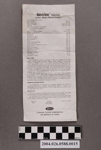 1. 本物件為臺灣氰胺股份有限公司製祈富靈膠囊說明書。說明書為單張紙,雙面有字,一面為中文,一面為英文。中文說明書內容有成分、適應症、作用、服法與劑量、注意事項等。