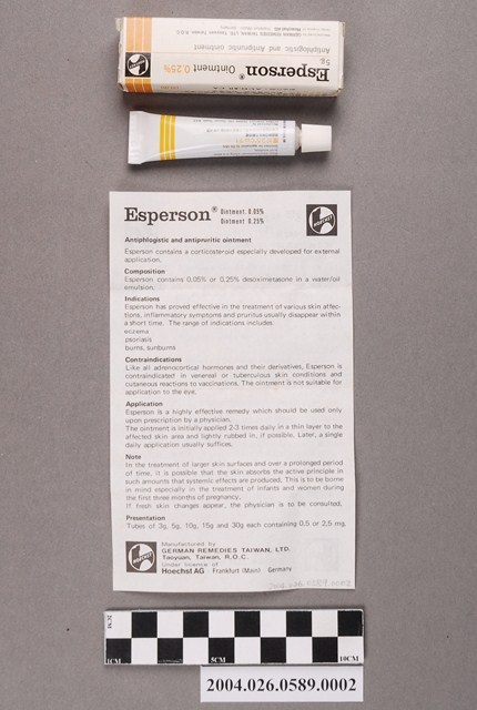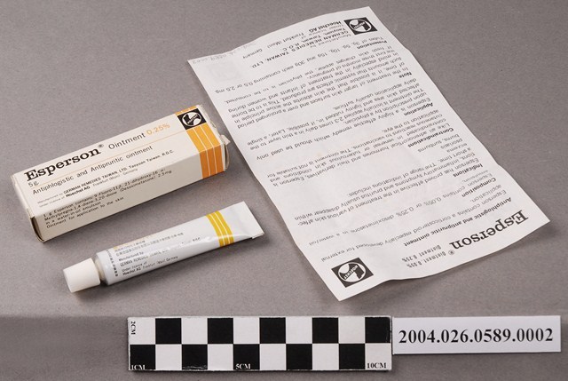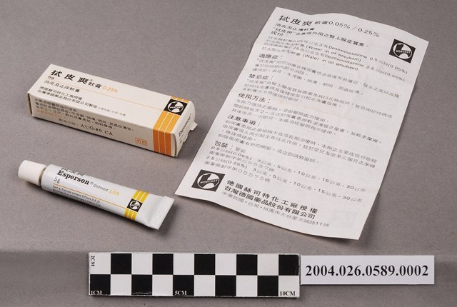 1. 本物件為台灣德國藥品股份有限公司製造拭皮爽軟膏。共有3個物品,包裝紙盒、軟管藥膏和說明書。包裝紙盒為長方體,其上印有拭皮爽軟膏、消炎及止癢軟膏等字樣。軟管藥膏為條狀,有拭皮爽、Esperson Ointment、5g等字樣。說明書為單張紙,雙面有字,其上印有成分、適應症、禁忌症、使用方法等內容。說明書一面為中文,一面為英文內容。 2. 本產品標有衛署藥製字第05575號,經查衛生福利部食品藥物管理署,其發證日期為西元1975年1月6日,故此產品應為此日期之後所生產。