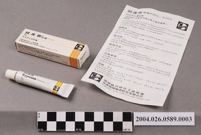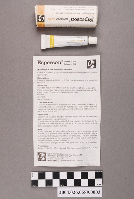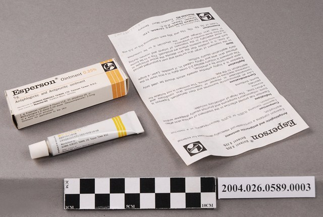 1. 本物件為台灣德國藥品股份有限公司製造拭皮爽軟膏。共有3個物品,包裝紙盒、軟管藥膏和說明書。包裝紙盒為長方體,其上印有拭皮爽軟膏、消炎及止癢軟膏等字樣。軟管藥膏為條狀,有拭皮爽、Esperson Ointment、5g等字樣。說明書為單張紙,雙面有字,其上印有成分、適應症、禁忌症、使用方法等內容。說明書一面為中文,一面為英文內容。 2. 本產品標有衛署藥製字第05575號,經查衛生福利部食品藥物管理署,其發證日期為西元1975年1月6日,故此產品應為此日期之後所生產。