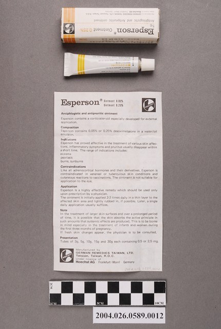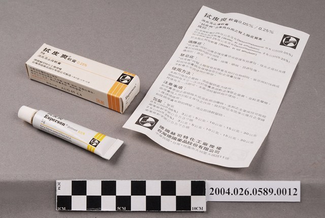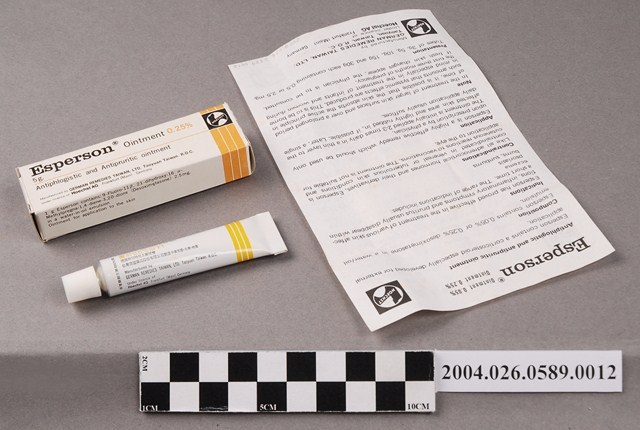 1. 本物件為台灣德國藥品股份有限公司製造拭皮爽軟膏。共有3個物品,包裝紙盒、軟管藥膏和說明書。包裝紙盒為長方體,其上印有拭皮爽軟膏、消炎及止癢軟膏等字樣。軟管藥膏為條狀,有拭皮爽、Esperson Ointment、5g等字樣。說明書為單張紙,雙面有字,其上印有成分、適應症、禁忌症、使用方法等內容。說明書一面為中文,一面為英文內容。 2. 本產品標有衛署藥製字第05575號,經查衛生福利部食品藥物管理署,其發證日期為西元1975年1月6日,故此產品應為此日期之後所生產。