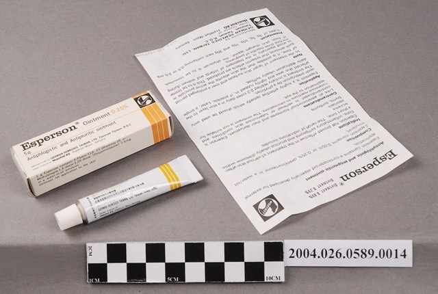1. 本物件為台灣德國藥品股份有限公司製造拭皮爽軟膏。共有3個物品,包裝紙盒、軟管藥膏和說明書。包裝紙盒為長方體,其上印有拭皮爽軟膏、消炎及止癢軟膏等字樣。軟管藥膏為條狀,有拭皮爽、Esperson Ointment、5g等字樣。說明書為單張紙,雙面有字,其上印有成分、適應症、禁忌症、使用方法等內容。說明書一面為中文,一面為英文內容。