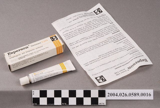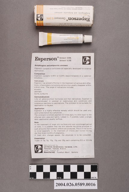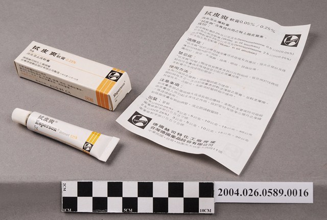 1. 本物件為台灣德國藥品股份有限公司製造拭皮爽軟膏。共有3個物品,包裝紙盒、軟管藥膏和說明書。包裝紙盒為長方體,其上印有拭皮爽軟膏、消炎及止癢軟膏等字樣。軟管藥膏為條狀,有拭皮爽、Esperson Ointment、5g等字樣。說明書為單張紙,雙面有字,其上印有成分、適應症、禁忌症、使用方法等內容。說明書一面為中文,一面為英文內容。 2. 本產品標有衛署藥製字第05575號,經查衛生福利部食品藥物管理署,其發證日期為西元1975年1月6日,故此產品應為此日期之後所生產。
