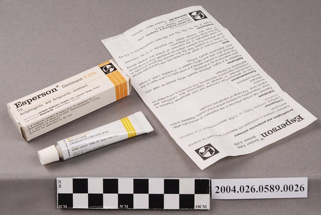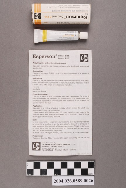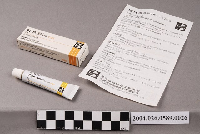 1. 本物件為台灣德國藥品股份有限公司製造拭皮爽軟膏。共有3個物品,包裝紙盒、軟管藥膏和說明書。包裝紙盒為長方體,其上印有拭皮爽軟膏、消炎及止癢軟膏等字樣。軟管藥膏為條狀,有拭皮爽、Esperson Ointment、5g等字樣。說明書為單張紙,雙面有字,其上印有成分、適應症、禁忌症、使用方法等內容。說明書一面為中文,一面為英文內容。 2. 本產品標有衛署藥製字第05575號,經查衛生福利部食品藥物管理署,其發證日期為西元1975年1月6日,故此產品應為此日期之後所生產。