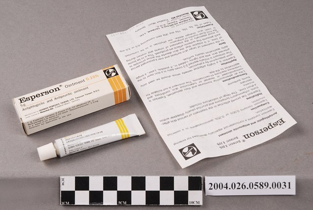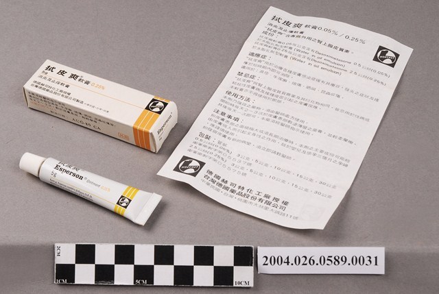 1. 本物件為台灣德國藥品股份有限公司製造拭皮爽軟膏。共有3個物品,包裝紙盒、軟管藥膏和說明書。包裝紙盒為長方體,其上印有拭皮爽軟膏、消炎及止癢軟膏等字樣。軟管藥膏為條狀,有拭皮爽、Esperson Ointment、5g等字樣。說明書為單張紙,雙面有字,其上印有成分、適應症、禁忌症、使用方法等內容。說明書一面為中文,一面為英文內容。 2. 本產品標有衛署藥製字第05575號,經查衛生福利部食品藥物管理署,其發證日期為西元1975年1月6日,故此產品應為此日期之後所生產。