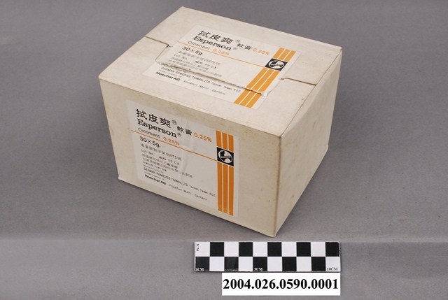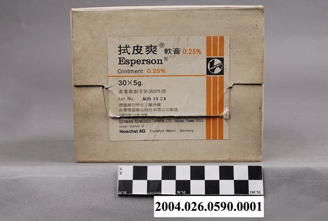 1. 本物件為台灣德國藥品股份有限公司製造拭皮爽軟膏包裝外盒。白色外盒貼有2張相同標籤,標籤上印有拭皮爽軟膏、0.25%、Esperson、Ointment、30x5g、衛署藥製字第05575號等字樣,以及製藥廠與授權資訊。