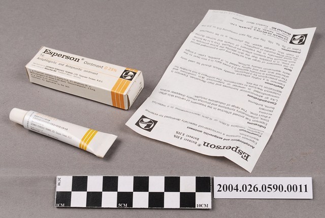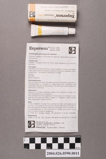 1. 本物件為台灣德國藥品股份有限公司製造拭皮爽軟膏。共有3個物品,包裝紙盒、軟管藥膏和說明書。包裝紙盒為長方體,其上印有拭皮爽軟膏、消炎及止癢軟膏等字樣。軟管藥膏為條狀,有拭皮爽、Esperson Ointment、5g等字樣。說明書為單張紙,雙面有字,其上印有成分、適應症、禁忌症、使用方法等內容。說明書一面為中文,一面為英文內容。