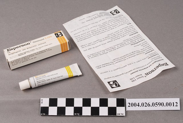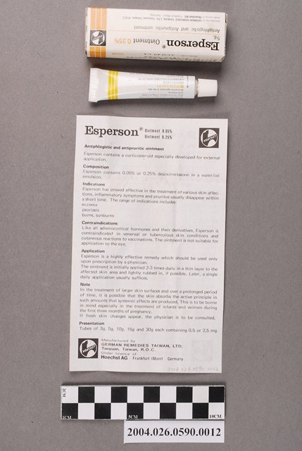 1. 本物件為台灣德國藥品股份有限公司製造拭皮爽軟膏。共有3個物品,包裝紙盒、軟管藥膏和說明書。包裝紙盒為長方體,其上印有拭皮爽軟膏、消炎及止癢軟膏等字樣。軟管藥膏為條狀,有拭皮爽、Esperson Ointment、5g等字樣。說明書為單張紙,雙面有字,其上印有成分、適應症、禁忌症、使用方法等內容。說明書一面為中文,一面為英文內容。