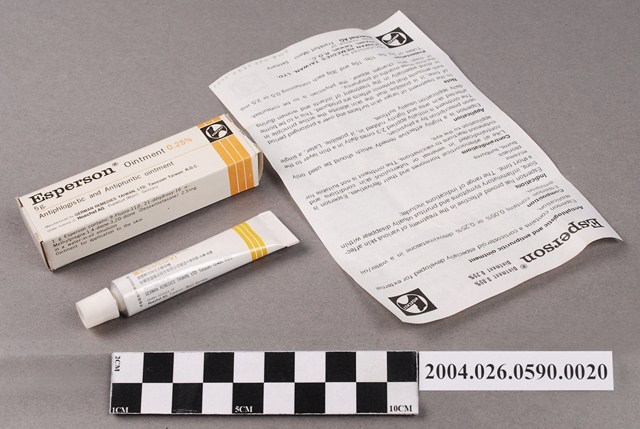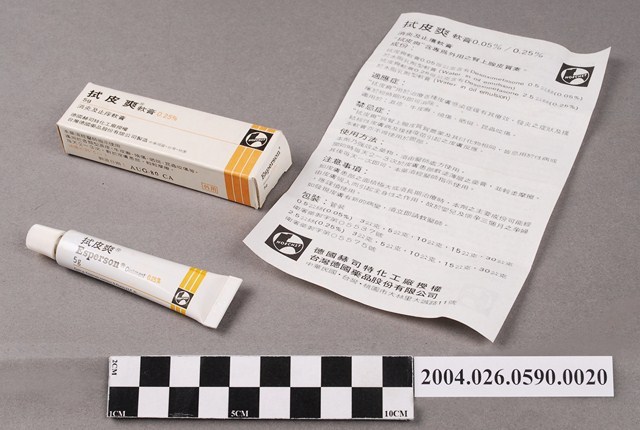 1. 本物件為台灣德國藥品股份有限公司製造拭皮爽軟膏。共有3個物品,包裝紙盒、軟管藥膏和說明書。包裝紙盒為長方體,其上印有拭皮爽軟膏、消炎及止癢軟膏等字樣。軟管藥膏為條狀,有拭皮爽、Esperson Ointment、5g等字樣。說明書為單張紙,雙面有字,其上印有成分、適應症、禁忌症、使用方法等內容。說明書一面為中文,一面為英文內容。