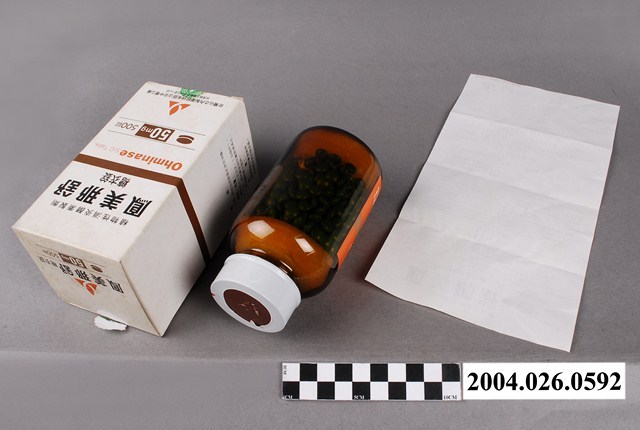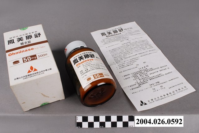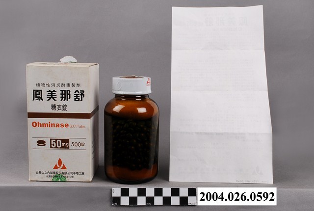 1. 本物件為台灣山之內製藥股份有限公司中壢工廠出品鳳美那舒糖衣錠。共有3個物品,分別是包裝紙盒、藥瓶和說明書。
