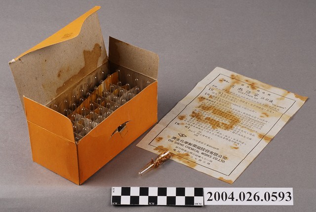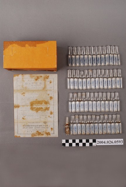 1.本物件為消熱倍寧注射液之包裝與說明書。共有3類物品,分別為包裝紙盒、注射劑十數隻與說明書。包裝紙盒和說明書有一些污漬。 2.中文品名「消熱倍寧注射液」,在衛生福利部食品藥物管理署有英文品名「SULPYRIN INJECTION "CHI SHENG"」,適應症為僅限阿司匹林乙醯氨基酚等內服藥品及其他非藥性解熱療法都無效或不能利用、有注射退燒針必要之高燒危急情況下、方可最後考慮使用,有內衛藥製字第005349號,有效日期為西元1999年,因改為外銷專用而註銷許可證。