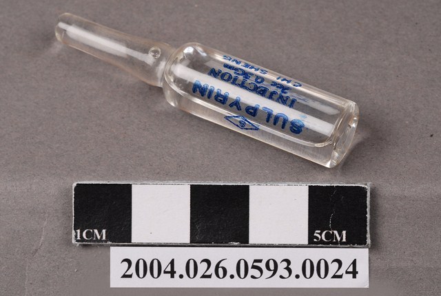 1.本物件為消熱倍寧注射液,此包裝為安瓿,容器總長約5公分,安瓿是用於盛裝藥液之小型容器。此容器為透明,內有透明液體,容器上有藍色字體「SULPYRIN INJECTION 2cc 05.gm CHI SHENG」與藥廠商標。部分注射液的外觀有污漬。