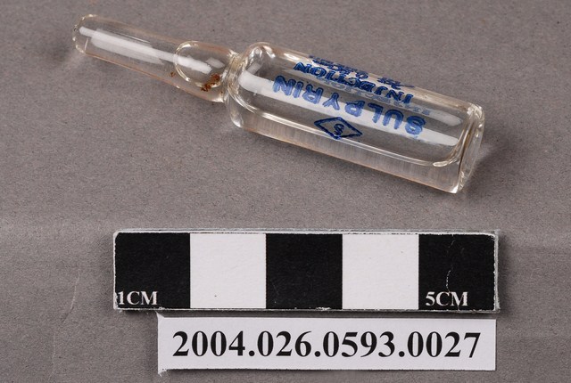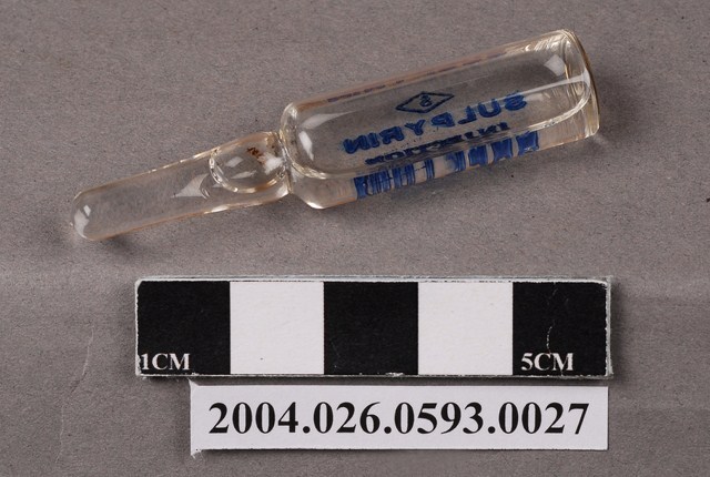 1.本物件為消熱倍寧注射液,此包裝為安瓿,容器總長約5公分,安瓿是用於盛裝藥液之小型容器。此容器為透明,內有透明液體,容器上有藍色字體「SULPYRIN INJECTION 2cc 05.gm CHI SHENG」與藥廠商標。部分注射液的外觀有污漬。