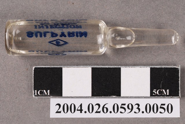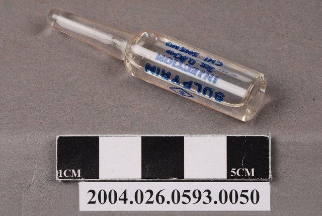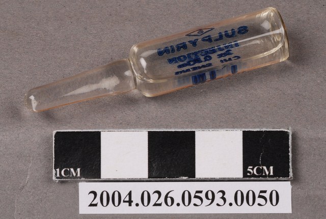 1.本物件為消熱倍寧注射液,此包裝為安瓿,容器總長約5公分,安瓿是用於盛裝藥液之小型容器。此容器為透明,內有透明液體,容器上有藍色字體「SULPYRIN INJECTION 2cc 05.gm CHI SHENG」與藥廠商標。部分注射液的外觀有污漬。