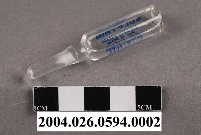 1.本物件為消熱倍寧注射液,此包裝為安瓿,容器總長約5公分,安瓿是用於盛裝藥液之小型容器。此容器為透明,內有透明液體,容器上有藍色字體「SULPYRIN INJECTION 2cc 05.gm CHI SHENG」與藥廠商標。