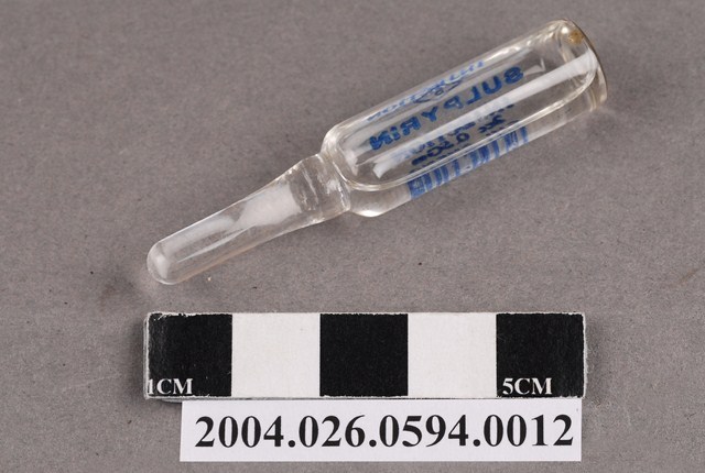 1.本物件為消熱倍寧注射液,此包裝為安瓿,容器總長約5公分,安瓿是用於盛裝藥液之小型容器。此容器為透明,內有透明液體,容器上有藍色字體「SULPYRIN INJECTION 2cc 05.gm CHI SHENG」與藥廠商標。部分注射液的外觀有污漬。