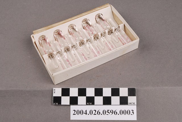 1.本物件為利魯卡因注射液第二層。一大盒紙盒內之其中第一層分隔層,並有一張薄紙用以區隔,此分隔層材質為紙質,一層分隔層有10個凹槽,凹槽可以固定藥劑使之不移動,將藥劑顛倒置放可以放置10入藥劑。第一層內有10瓶藥劑。藥劑之包裝為安瓿,用於盛裝藥液之小型容器,此藥劑外觀應為透明玻璃材質,瓶身印有紅色印刷字體。