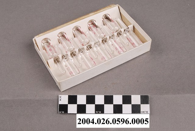 1.本物件為利魯卡因注射液第四層。一大盒紙盒內之其中第一層分隔層,並有一張薄紙用以區隔,此分隔層材質為紙質,一層分隔層有10個凹槽,凹槽可以固定藥劑使之不移動,將藥劑顛倒置放可以放置10入藥劑。第一層內有10瓶藥劑。藥劑之包裝為安瓿,用於盛裝藥液之小型容器,此藥劑外觀應為透明玻璃材質,瓶身印有紅色印刷字體。